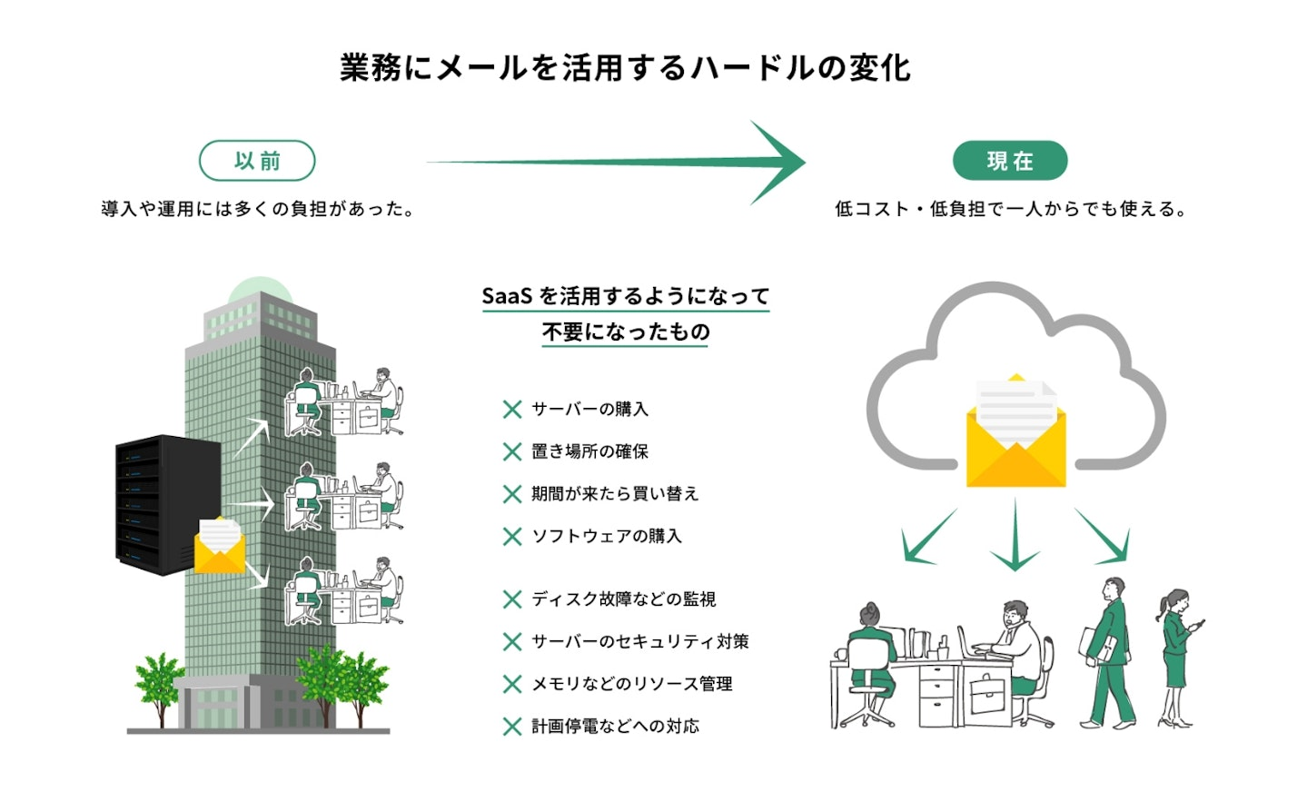 さらに、企業は会計、給与、稟議システムやビジネスチャットなど様々な業務システムを管理する必要がありますが、これは一つ一つに対して個別の管理を行うことが難しいです。GmailやOffice365のようなSaaSサービスでは、運用コストは存在しますが、保守作業は最小限で済み、より効率的なシステム管理が可能です。